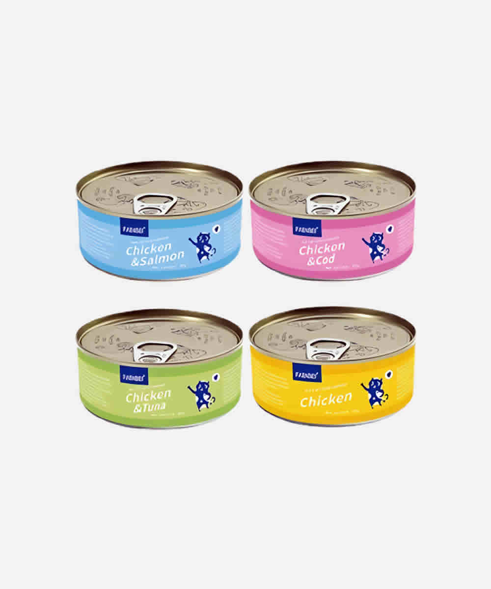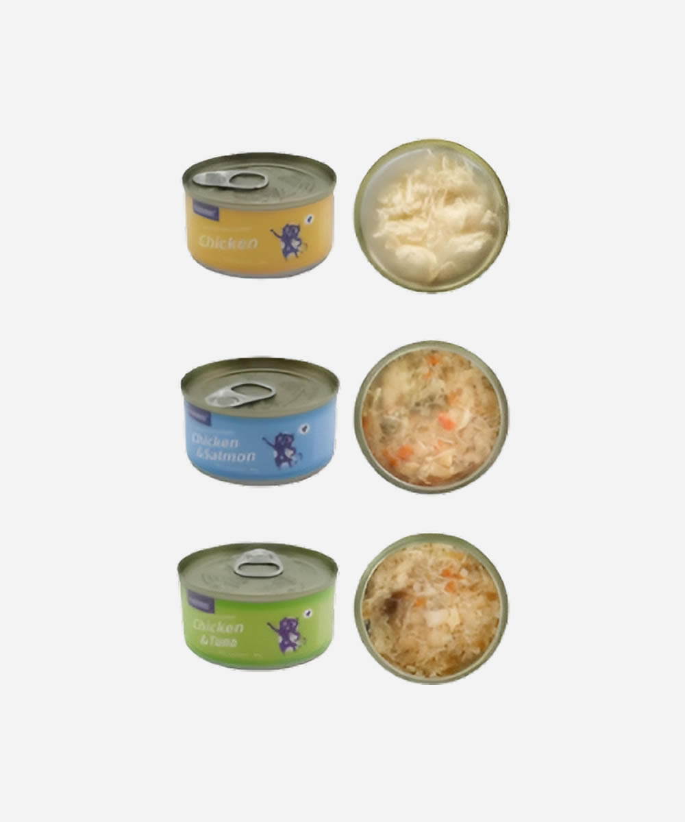 Canned Food 85g Chicken flavor Broth or Jelly, Chicken+tuna flavor Broth or Jelly & Chicken + Salmon flavor Broth or Jelly.